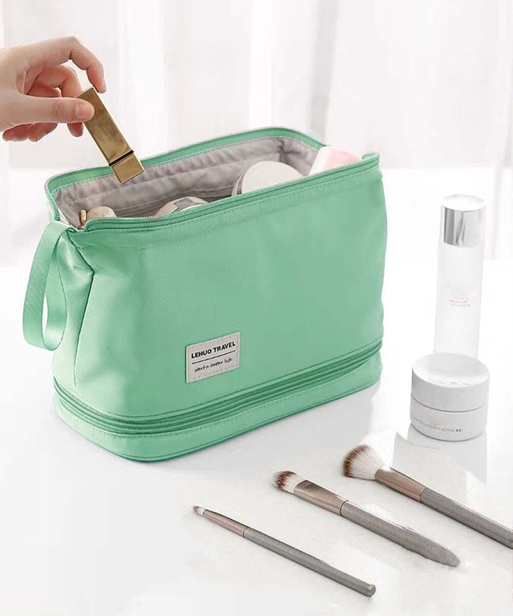 上下二段に分かれ、化粧品と化粧道具を別々に収納できる便利な大容量コスメポーチ
