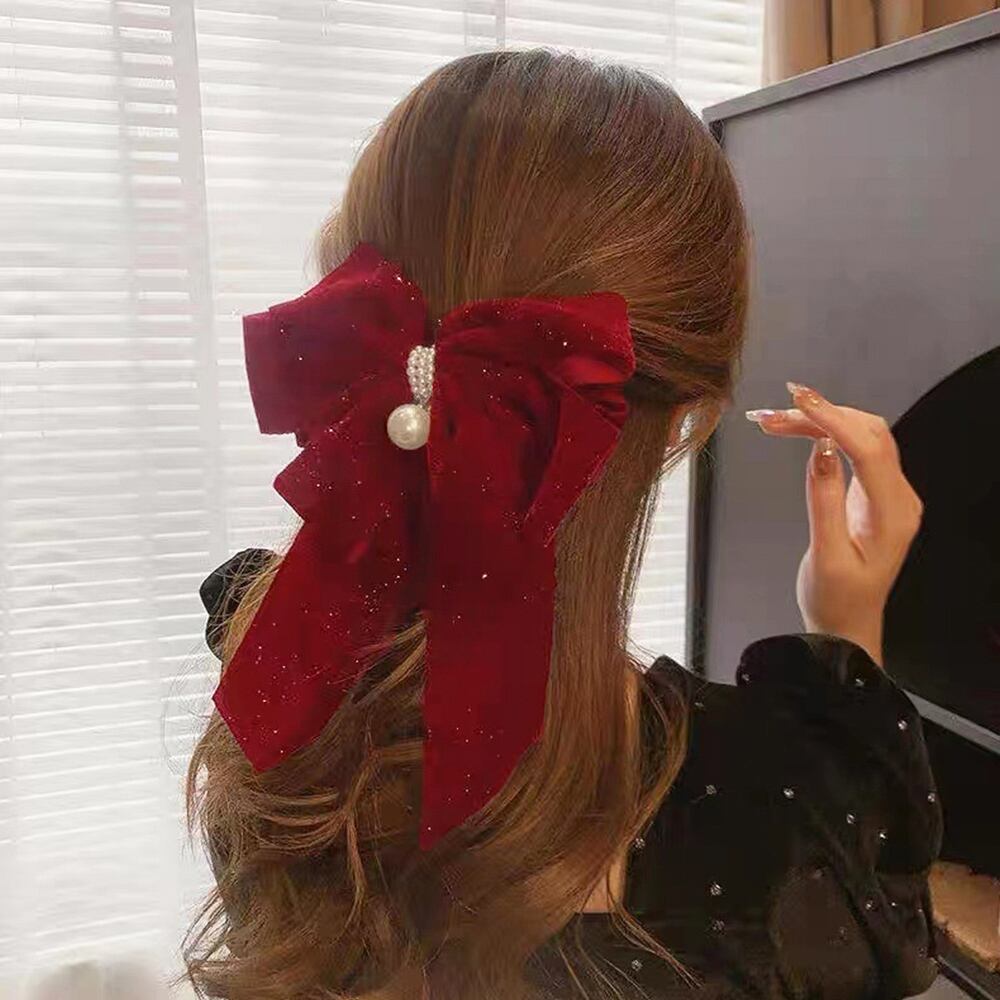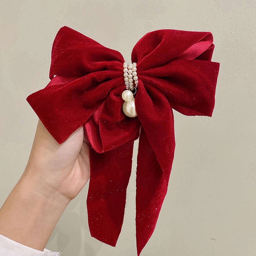 キラキラベロア 大きめリボン 髪飾り 大人可愛いファッション小物 フェイクパール付き おしゃれ 髪留め 流行りボリューム